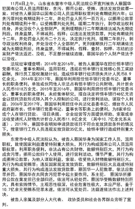 近日,恒豐銀行原董事長蔡國華犯國有公司人員濫用職權(quán)、貪污、挪用公款、受賄、違法發(fā)放貸款罪一案一審公開宣判。
