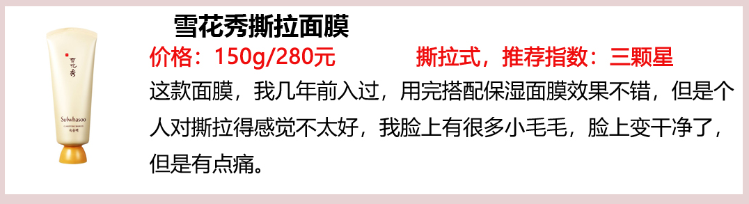 幾年前入過雪花秀撕拉面膜,對有黑頭的皮膚比較友好,用完會有臟東西粘下來,再搭配保濕面膜,效果更好。