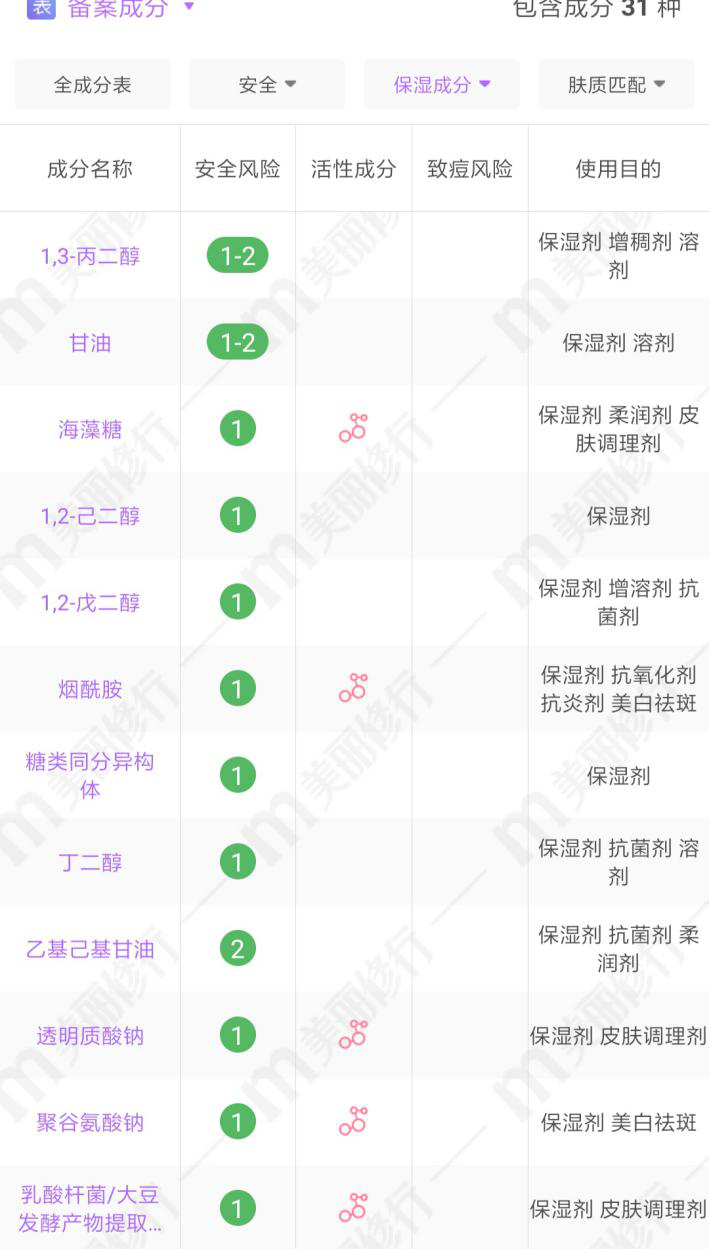 它有5種活性成分,保濕能力超強(qiáng)。其中的煙酰胺我非常喜歡,它除了保濕、控油的基礎(chǔ)功能外,還有抗糖基化的功能,可以幫助皮膚保持活性,延緩老化。