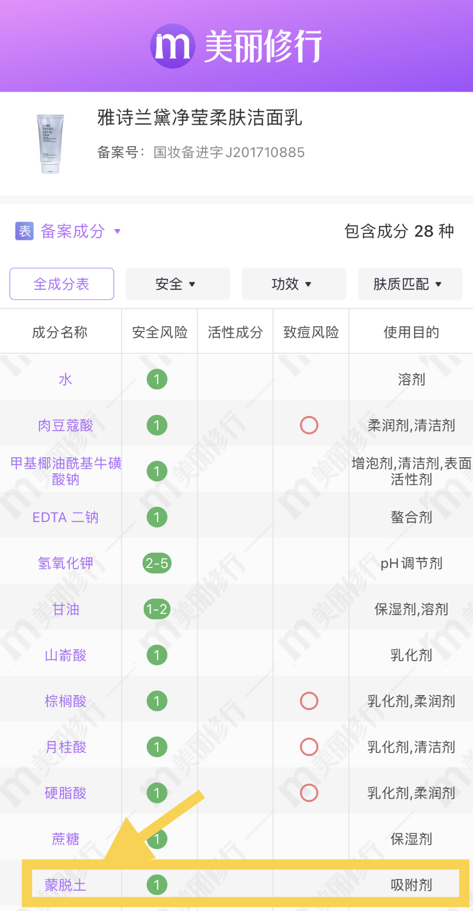 主要成分和他們家洗面奶一樣是蒙脫土,蒙脫土很多人可能不清楚,它是一種火山凝灰?guī)r風(fēng)化后的產(chǎn)物,具很強(qiáng)的吸附力和陽(yáng)離子交換性,很安全,孕婦也可以用,雅詩(shī)蘭黛的凈瑩柔膚潔面乳使用的也是這種成分。