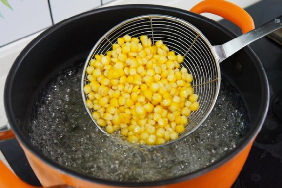 第三步:鍋中加適量水,鍋開后將豌豆、胡蘿卜,玉米粒焯水備用。