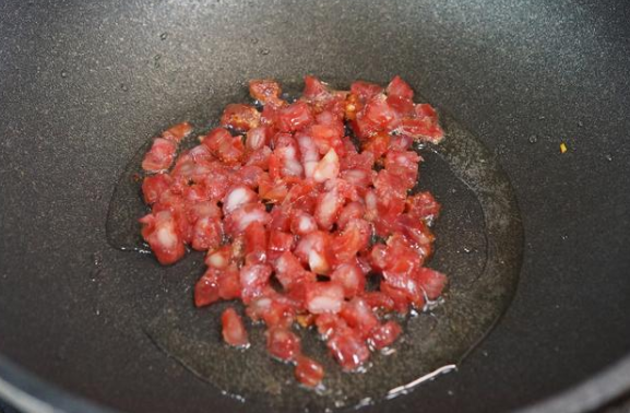 第四步:鍋熱加入適量油,油五成熱加入臘腸小火翻炒。