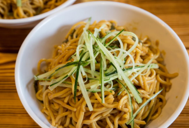 食材明細(xì):面條、芝麻醬、綠豆芽、黃瓜、胡蘿卜、雞蛋、蒜、香蔥、油炸花生米、鹽、雞汁、白糖、香醋。