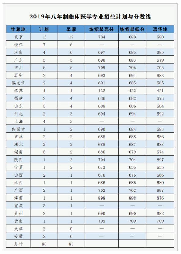 2019年北京協(xié)和醫(yī)學(xué)院八年制臨床醫(yī)學(xué)專業(yè)高考招生計(jì)劃90名,根據(jù)教育部的政策取消了二次招生。實(shí)際高招錄取85名,其中有全省排名前10的考生5名、全國(guó)生物和化學(xué)競(jìng)賽金牌保送生5名。