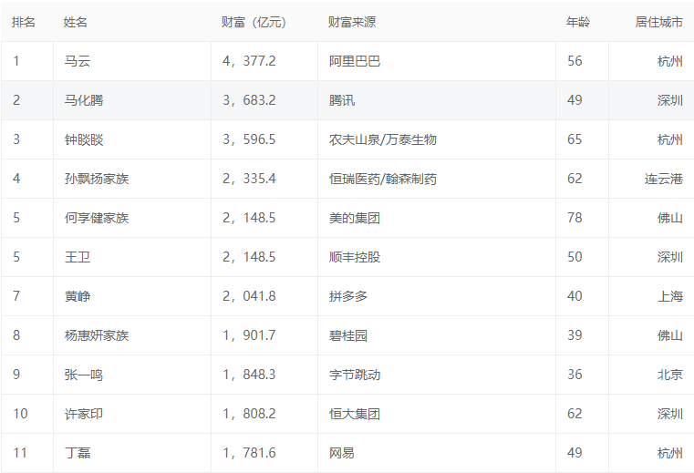 下面是2020年福布斯中國(guó)富豪榜前十名榜單: